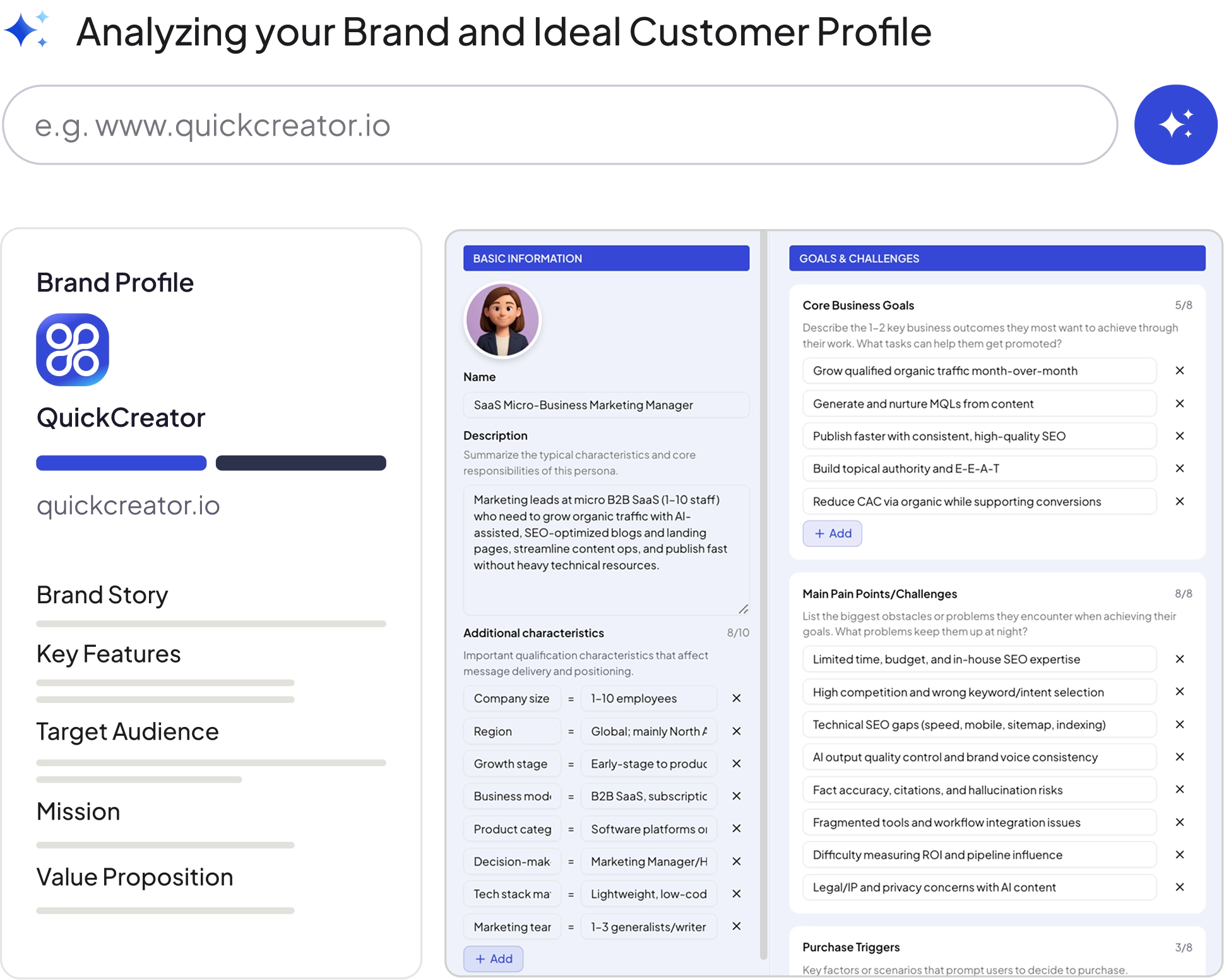 QuickCreator's Brand Intelligence Agent builds a deep model of your brand — analyzing your tone, vocabulary, messaging pillars, audience language, and values. This brand profile is shared across all other agents, so every piece of content is filtered through your brand identity before it's published. Unlike style guides that agents may ignore, the Brand Intelligence Agent actively corrects off-brand drift as it happens.